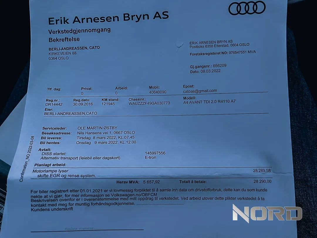 ✅ 08.03.2022 wymieniony został EGR, koszt serwisu 28.290 koron norweskich w ASO audi