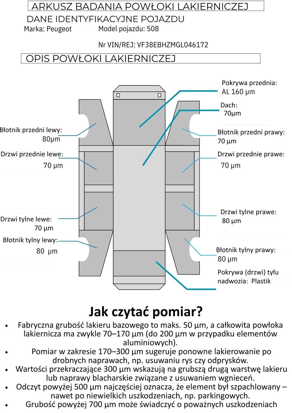 ✅ Każdy samochód przed trafieniem do sprzedaży jest dokładnie sprawdzany pod kątem usterek mechanicznych oraz stanu lakierniczego. Na zdjęciu widoczny jest arkusz badania powłoki lakierniczej, przedstawiający jej grubość.